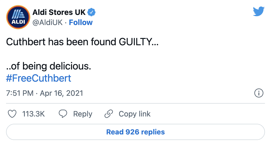 In April 2021, Marks and Spencer filed a lawsuit against Aldi in a bid to remove Cuthbert the Caterpillar Cake off their shelves. They claimed it infringed on their trademark of Colin the Caterpillar cake. Since then, Aldi has basically taken social media by storm. Especially on Twitter, with their witty comments, great humour and engaging campaigns.
